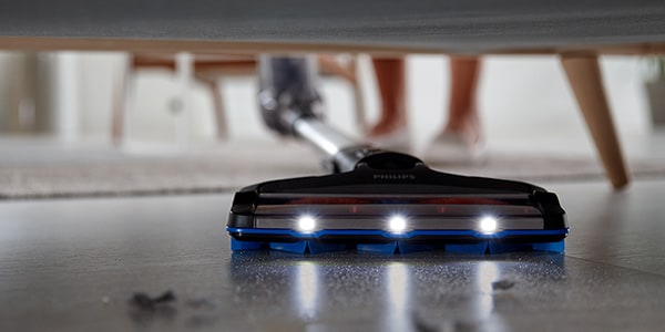 Uzgalī uzstādītās gaismas diodes atvieglo sūkšanu zem mēbelēm un citur, kur nepieciešams papildu apgaismojums.