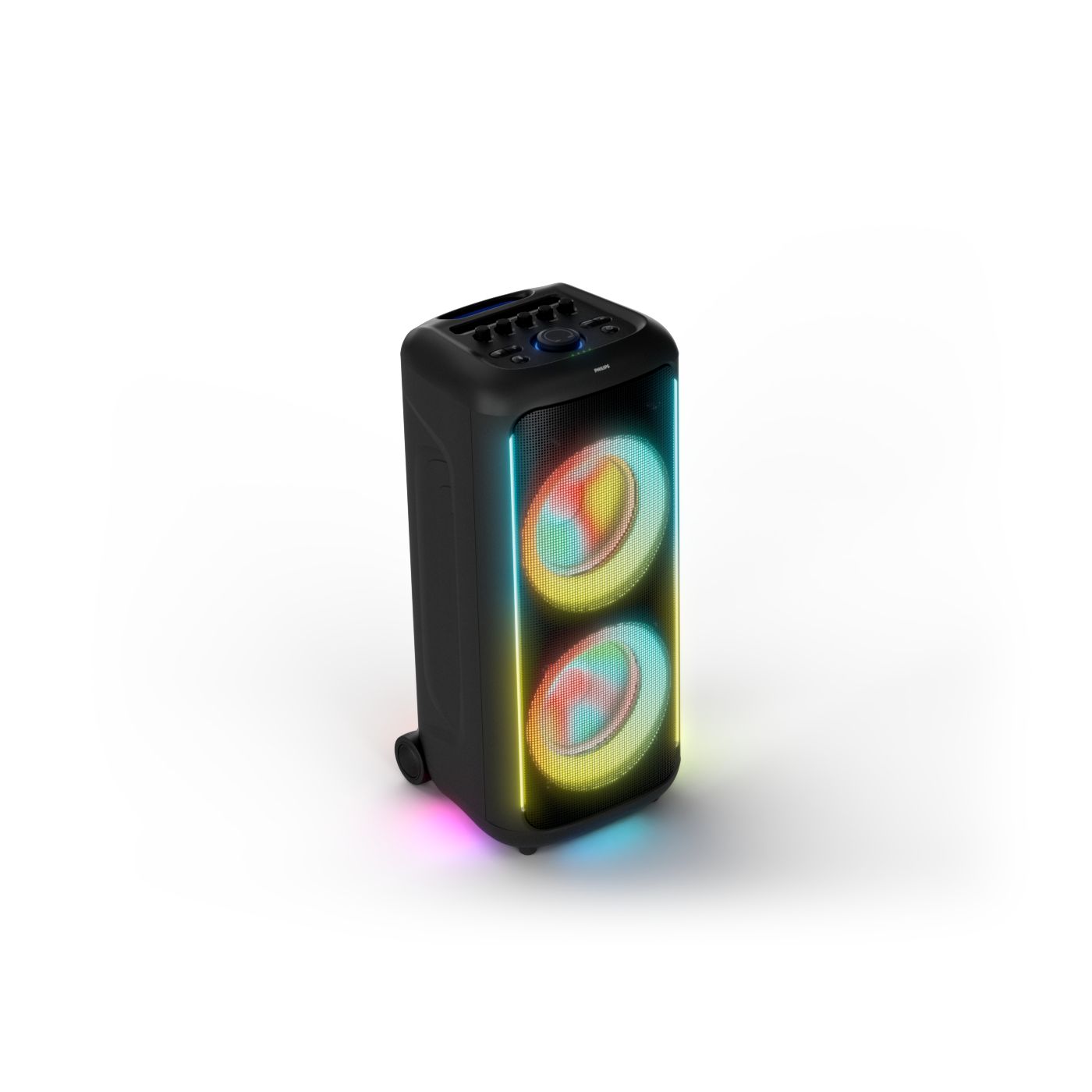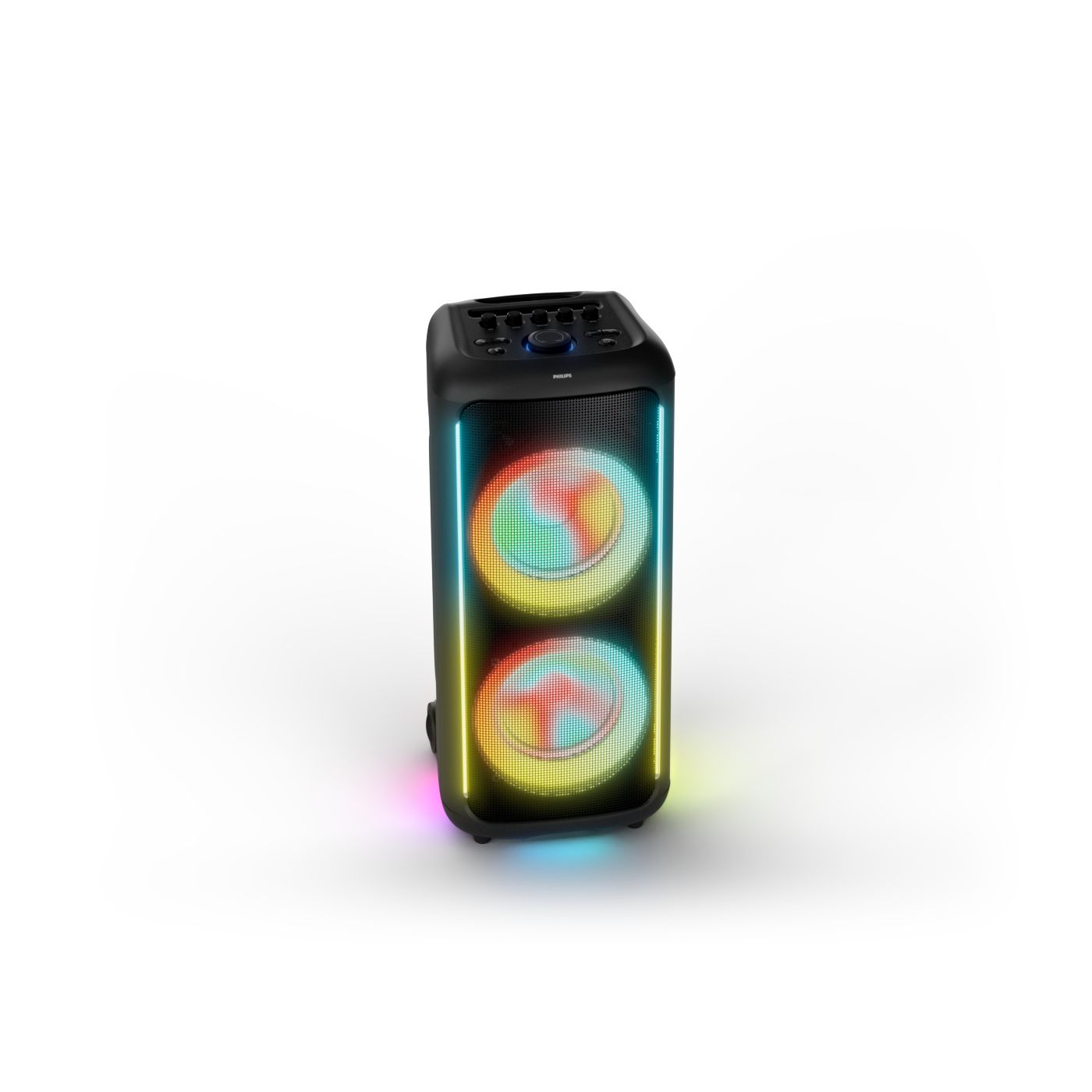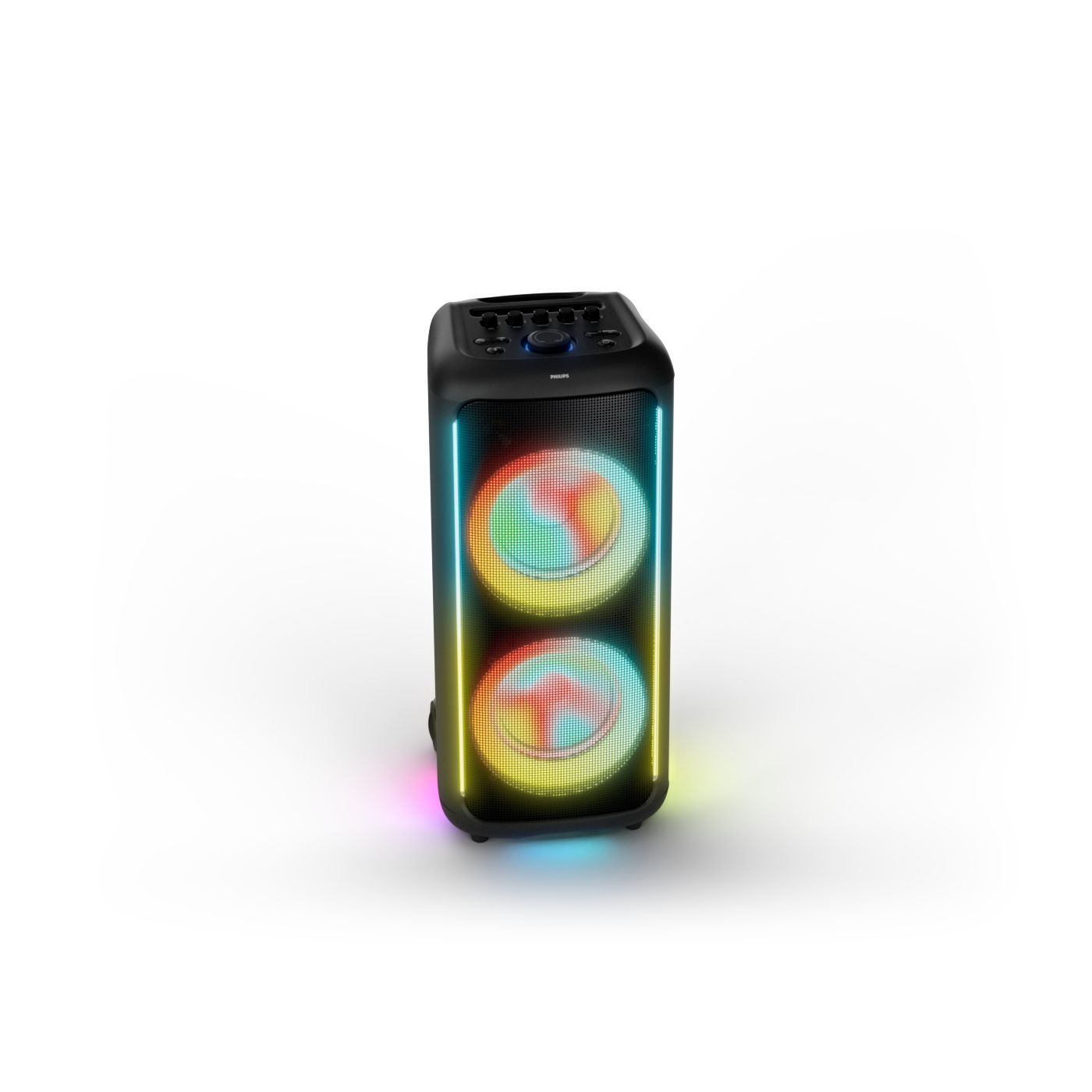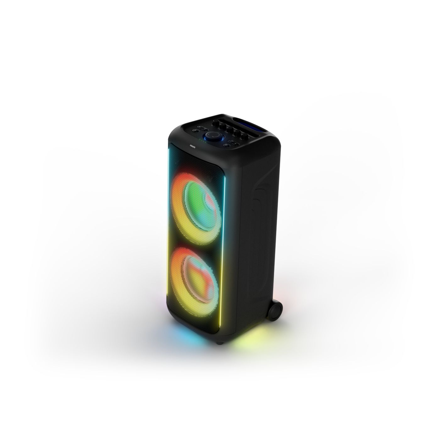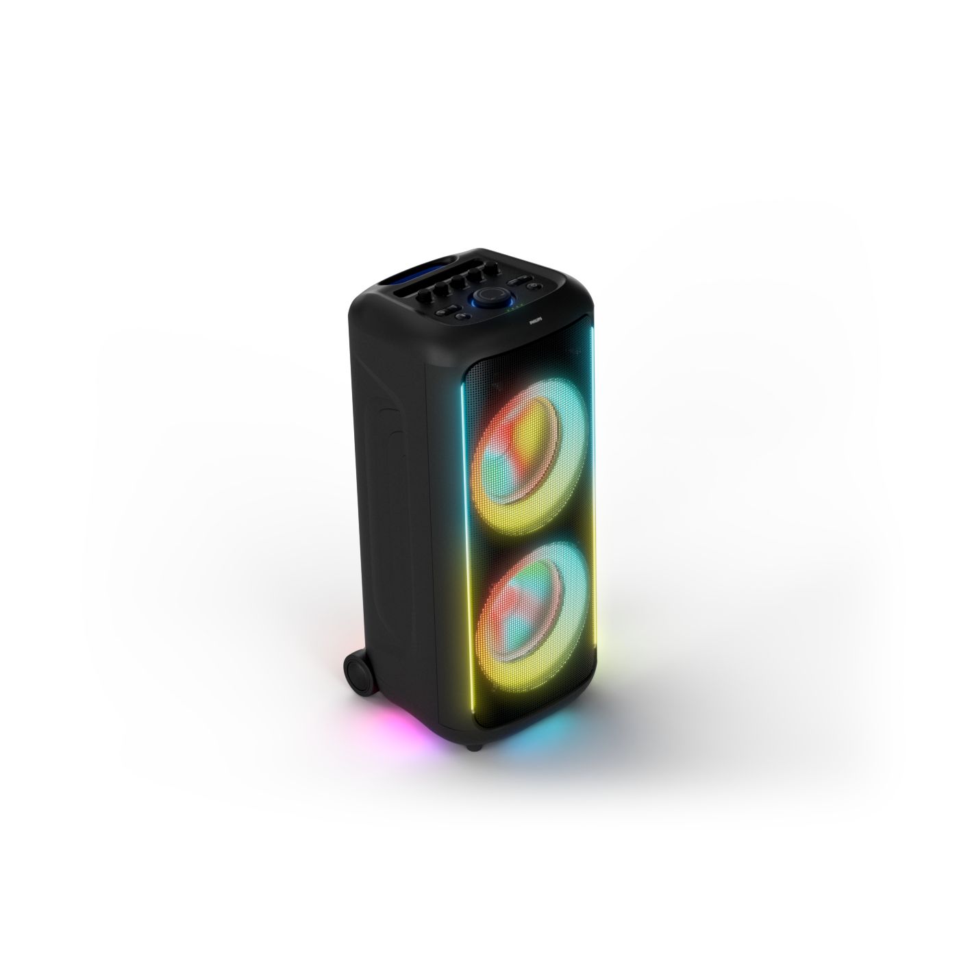 osvětlení má mnoho režimů. Svítí I Dole Vše se dá vypnout.+Nastavení dvou mikrofonu a kytary.A ještě zvlášť extra pro basy. (Extra bass). Velké plus je i vyměnitelná baterie. Kolečka kvalitní pevné. Bluetooth po celém bytě bez problémů. Zvuk v této cenovce bez konkurenční. 2 x 20 cm repro jde opravdu znát ( JBL120 165cm). Zvuk krásný čistý jak výšky tak basy. Do 80% volume naprosto čistý. Basy se dají i přidat extra tlačítkem Reproduktor hraje hutněji a (200watt ) než JBL p box120 za 7000. Silnější výkon a větší reproduktory jdou znát. V této cenové kategorii nejlepší. Philips je přece jen značka s dlouholetou tradicí. Stereo. veškerá elektronika vždy kvalitní. Sám mám stereo 2x50 watt Philips už 10let bez problémů. Po JBL party box 120 je tento Philips nejlepší volba. Zkoušel jsem LG v této cenové kategorii.do 5000 LG X-boom XL 5s srovnatelné zvukově ale horší osvětlení led, baterie nejde vyměnit, stará verze Bluetooth. Celkově jde znát že je LG už 4 roky