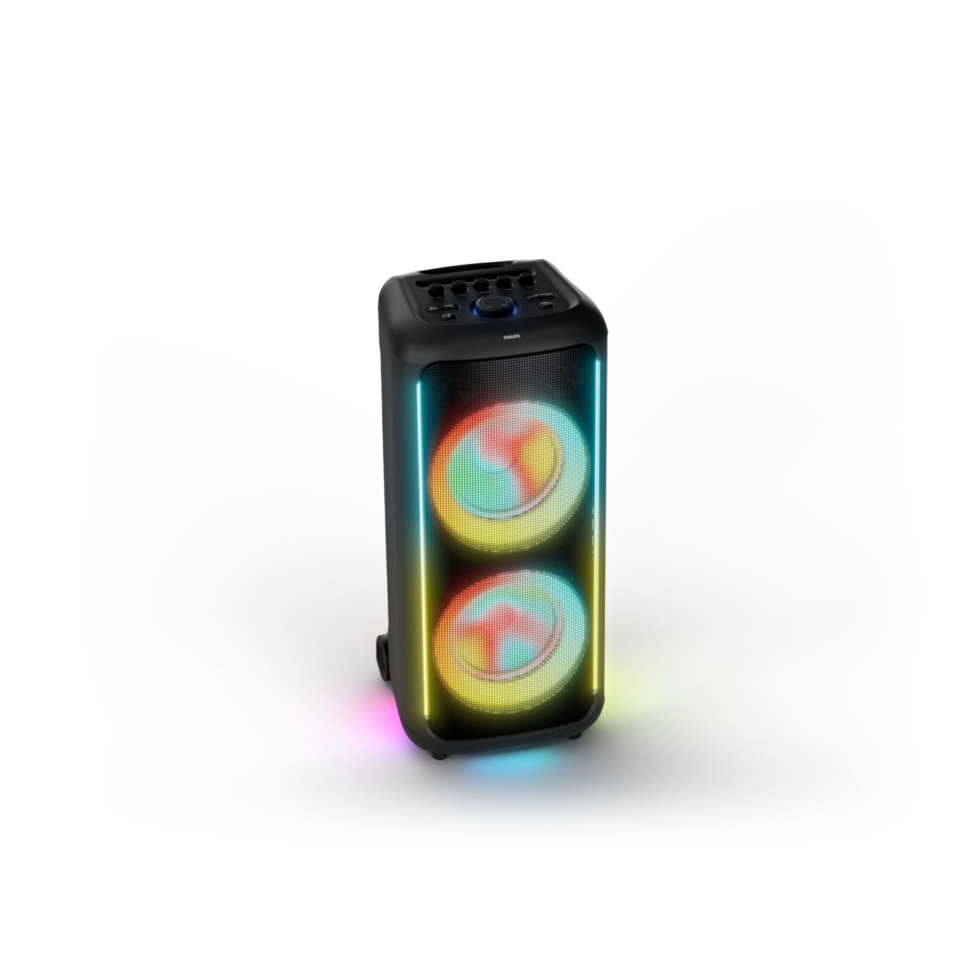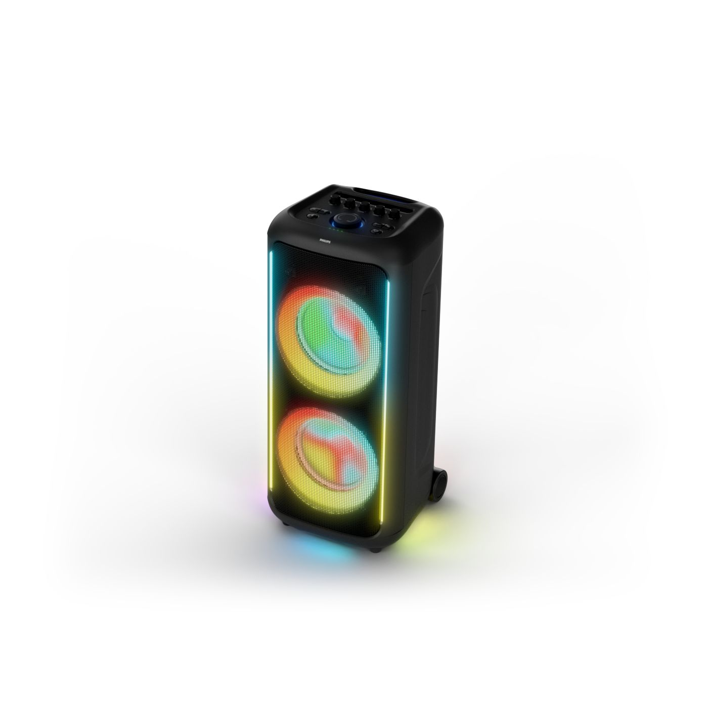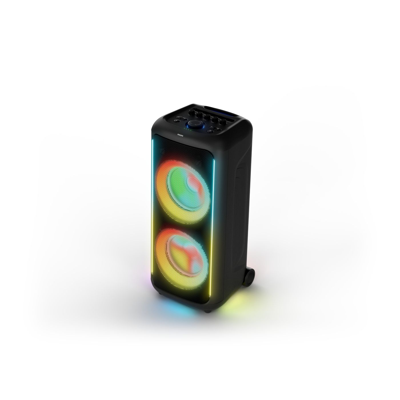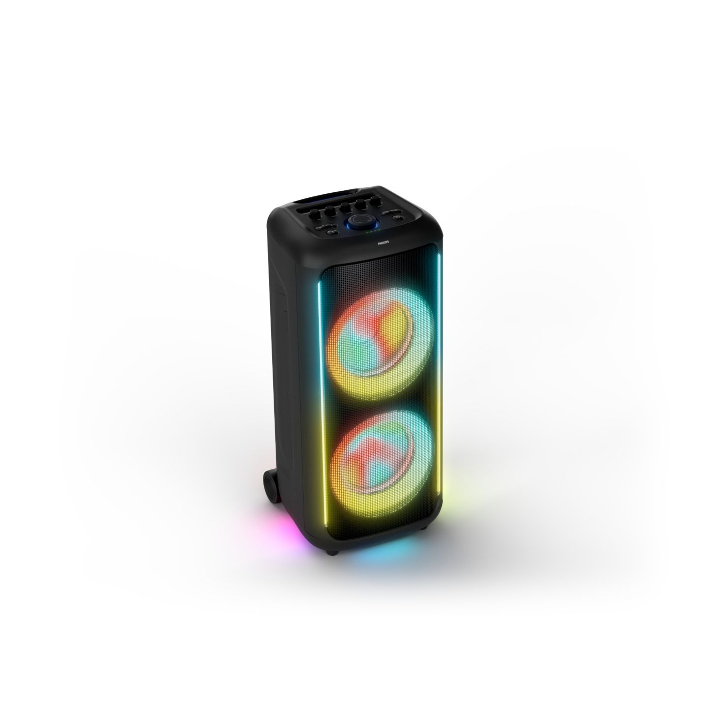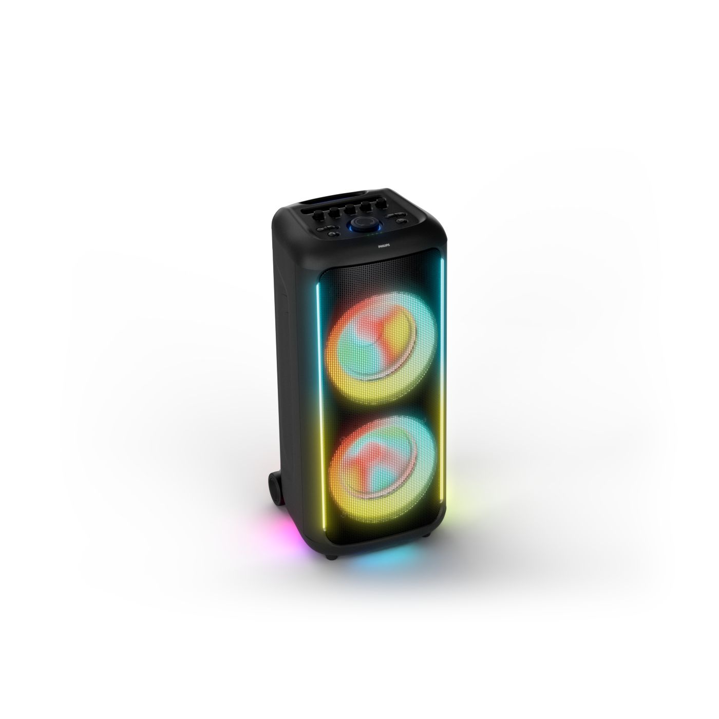 osvětlení má mnoho režimů. Svítí I Dole Vše se dá vypnout.+Nastavení dvou mikrofonu a kytary.A ještě zvlášť extra pro basy. (Extra bass). Velké plus je i vyměnitelná baterie. Kolečka kvalitní pevné. Bluetooth po celém bytě bez problémů. Zvuk v této cenovce bez konkurenční. 2 x 20 cm repro jde opravdu znát ( JBL120 165cm). Zvuk krásný čistý jak výšky tak basy. Do 80% volume naprosto čistý. Basy se dají i přidat extra tlačítkem Reproduktor hraje hutněji a (200watt ) než JBL p box120 za 7000. Silnější výkon a větší reproduktory jdou znát. V této cenové kategorii nejlepší. Philips je přece jen značka s dlouholetou tradicí. Stereo. veškerá elektronika vždy kvalitní. Sám mám stereo 2x50 watt Philips už 10let bez problémů. Po JBL party box 120 je tento Philips nejlepší volba. Zkoušel jsem LG v této cenové kategorii.do 5000 LG X-boom XL 5s srovnatelné zvukově ale horší osvětlení led, baterie nejde vyměnit, stará verze Bluetooth. Celkově jde znát že je LG už 4 roky