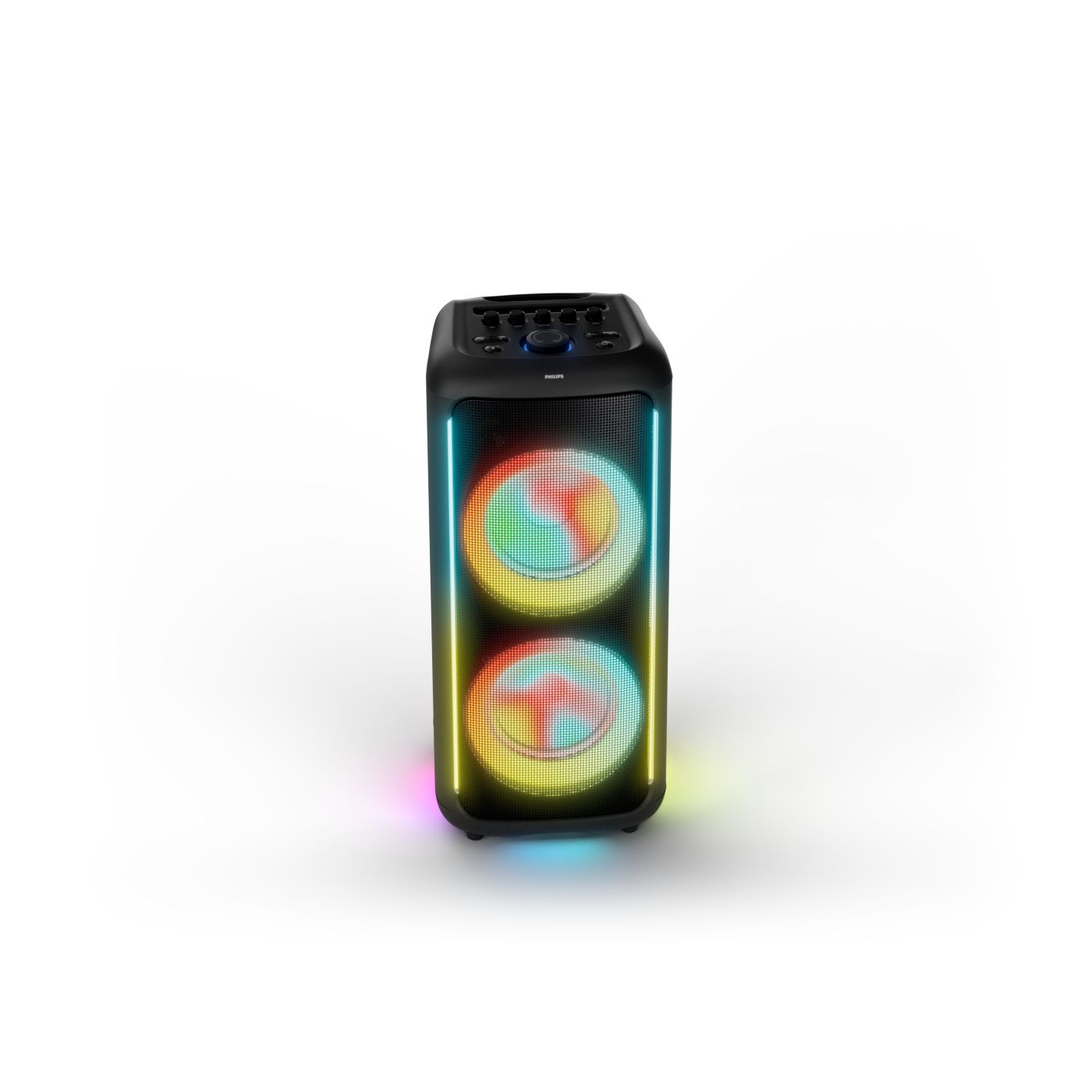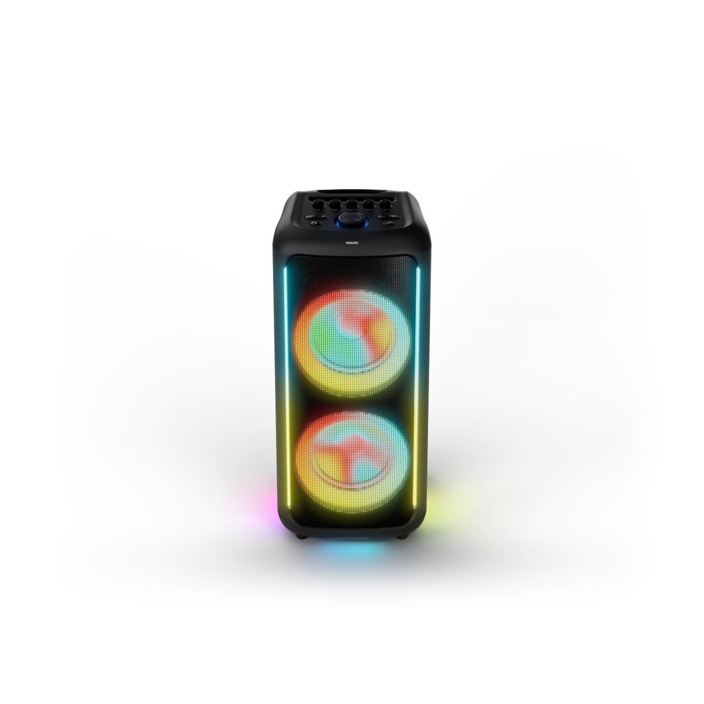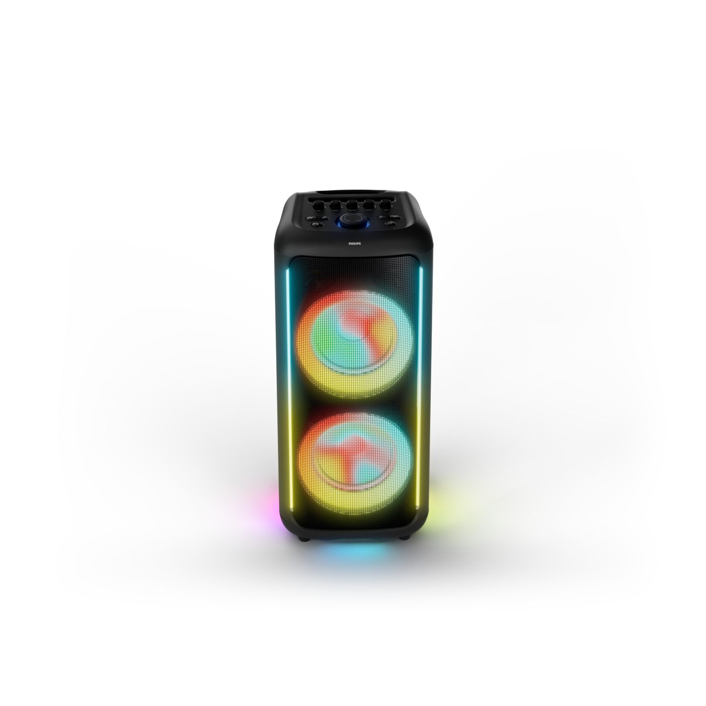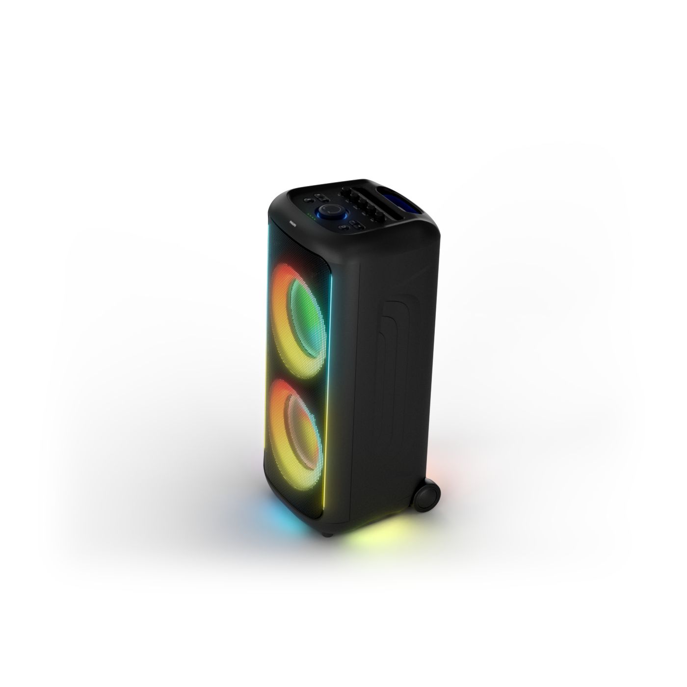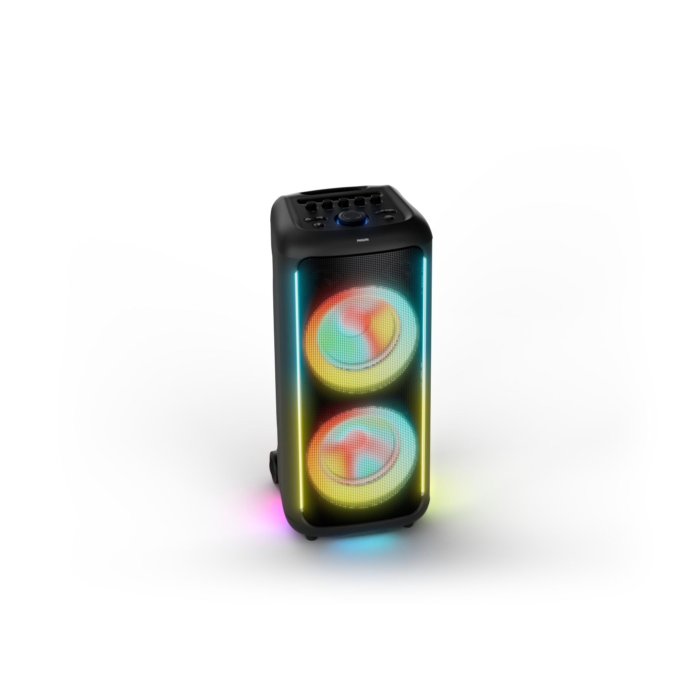 osvětlení má mnoho režimů. Svítí I Dole Vše se dá vypnout.+Nastavení dvou mikrofonu a kytary.A ještě zvlášť extra pro basy. (Extra bass). Velké plus je i vyměnitelná baterie. Kolečka kvalitní pevné. Bluetooth po celém bytě bez problémů. Zvuk v této cenovce bez konkurenční. 2 x 20 cm repro jde opravdu znát ( JBL120 165cm). Zvuk krásný čistý jak výšky tak basy. Do 80% volume naprosto čistý. Basy se dají i přidat extra tlačítkem Reproduktor hraje hutněji a (200watt ) než JBL p box120 za 7000. Silnější výkon a větší reproduktory jdou znát. V této cenové kategorii nejlepší. Philips je přece jen značka s dlouholetou tradicí. Stereo. veškerá elektronika vždy kvalitní. Sám mám stereo 2x50 watt Philips už 10let bez problémů. Po JBL party box 120 je tento Philips nejlepší volba. Zkoušel jsem LG v této cenové kategorii.do 5000 LG X-boom XL 5s srovnatelné zvukově ale horší osvětlení led, baterie nejde vyměnit, stará verze Bluetooth. Celkově jde znát že je LG už 4 roky