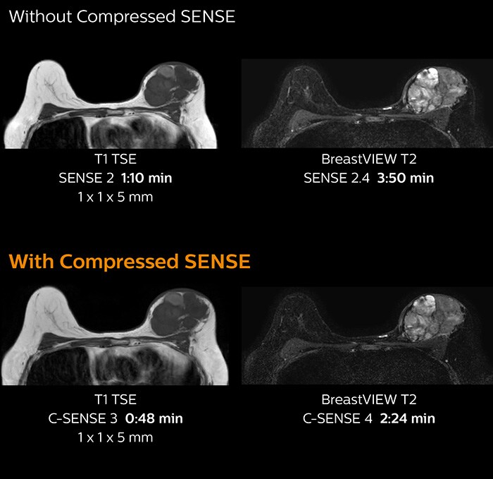 For breast imaging, a fast, high resolution scan can be important for a female patient having to lie in an uncomfortable, face-down position in the scanner. Compressed SENSE also helps us to obtain higher1 quality images using 3D BreastVIEW and 3D high resolution mDIXON sequences in the same examination time as in our previous exam protocol.