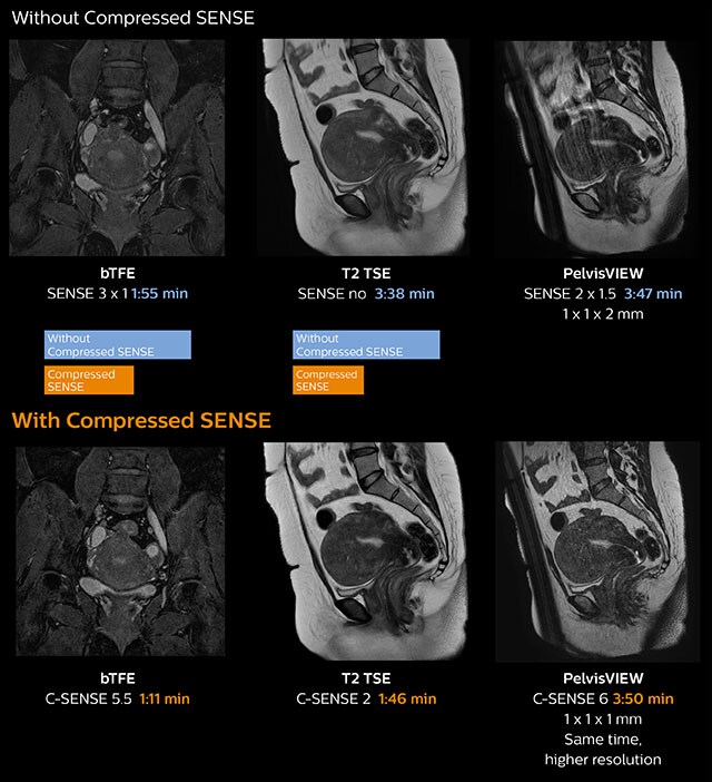 In this MRI exam of pelvis in a patient with myoma, Compressed SENSE is used to accelerate individual sequences and thus the entire examination on Ingenia 1.5T. Compressed SENSE allowed for a decrease in scan time for the T2 TSE from 3:38 to 1:46 minutes. The Compressed SENSE images in this case show fewer motion artifacts than the images from the previous protocol with SENSE. In 3D PelvisVIEW, the Compressed SENSE images have a higher and isotropic spatial resolution with a scan time similar to the SENSE sequence. The improved spatial resolution and better contrast in the myometrium of the uterus allowed radiologist Dr. Koyama to confidently diagnose the cancerous lesion in the uterus. The use of Compressed SENSE accelerates scanning times and increases spatial resolution in 3D PelvisVIEW.