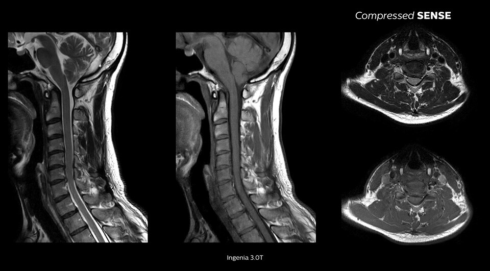 Thanks to the diversity of 2D and 3D MRI techniques, you can obtain a wealth of information about each individual case if you just have enough time. Compressed SENSE can give you the time and critical details you need to make confident decisions. For example, to obtain high spatial resolution of tiny nerves and vessels for brain and spine examinations, you can now replace 2D MRI scan sequences with faster 3D sequences. Compressed SENSE also gives you room to add extra routine and functional sequences to deepen diagnostic confidence.